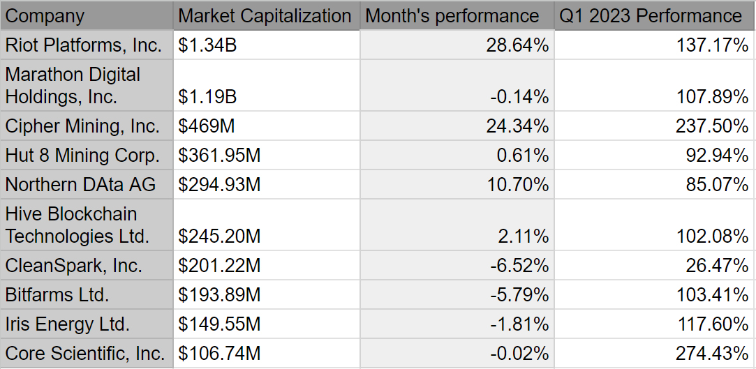 En consecuencia, durante el mes de marzo, la ganancia promedio de las 10 principales acciones mineras fue de 0,30%. Según datos publicados por CoinTelegraph, el crecimiento de las acciones del sector fue liderado por Riot Platforms y Cipher Mining con crecimientos respectivos de 28,64% y 24,34%.